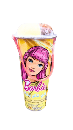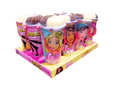 Barbie-themed snack cups with crunchy biscuit sticks and two dreamy dips—rich chocolate and smooth vanilla.