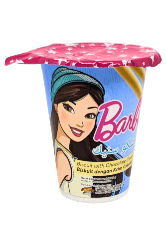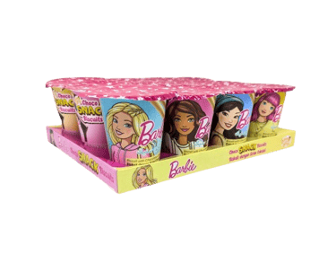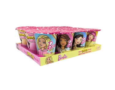 A medium-sized Barbie-themed snack cup with crunchy biscuit sticks and luscious chocolate cream. Perfectly portioned for snack time.