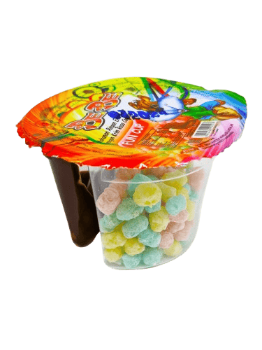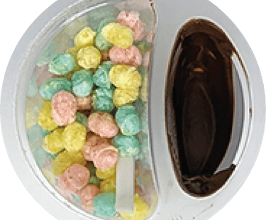 Colorful rice crispies paired with a creamy, chocolate-flavored dip. Each compartmentalized cup lets you dunk the crispy rice into the smooth, sweet cream for joyful fun.