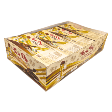 Snack pack of crisp biscuit sticks paired with a premium, creamy, hazelnut dip in an attractive square tray.